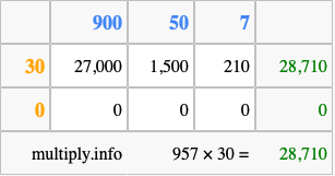 Below is an illustration showing you how to calculate 957 times 30 using the box method, using the instructions above.