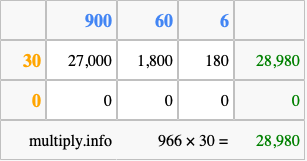 Below is an illustration showing you how to calculate 966 times 30 using the box method, using the instructions above.