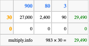 Below is an illustration showing you how to calculate 983 times 30 using the box method, using the instructions above.