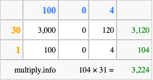 That's all there is to it! As you can see from the box above, the answer to 104 times 31 using the box method is 3,224.