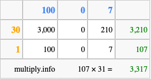 Below is an illustration showing you how to calculate 107 times 31 using the box method, using the instructions above.