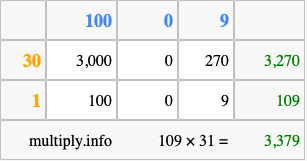 That's all there is to it! As you can see from the box above, the answer to 109 times 31 using the box method is 3,379.