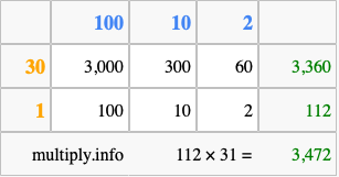 Below is an illustration showing you how to calculate 112 times 31 using the box method, using the instructions above.
