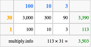 Below is an illustration showing you how to calculate 113 times 31 using the box method, using the instructions above.