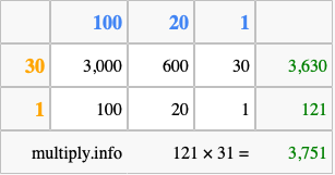 That's all there is to it! As you can see from the box above, the answer to 121 times 31 using the box method is 3,751.