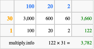 That's all there is to it! As you can see from the box above, the answer to 122 times 31 using the box method is 3,782.