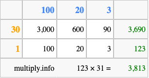 That's all there is to it! As you can see from the box above, the answer to 123 times 31 using the box method is 3,813.