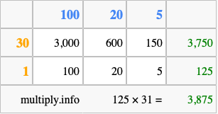 That's all there is to it! As you can see from the box above, the answer to 125 times 31 using the box method is 3,875.