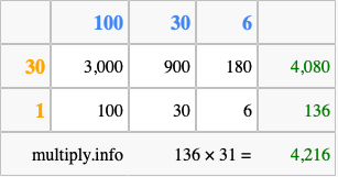 That's all there is to it! As you can see from the box above, the answer to 136 times 31 using the box method is 4,216.