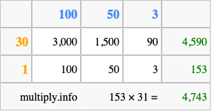 That's all there is to it! As you can see from the box above, the answer to 153 times 31 using the box method is 4,743.