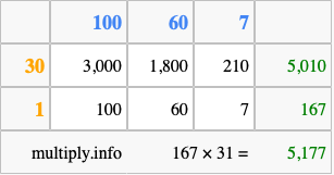 Below is an illustration showing you how to calculate 167 times 31 using the box method, using the instructions above.