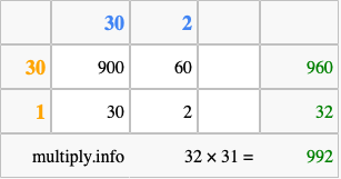 That's all there is to it! As you can see from the box above, the answer to 32 times 31 using the box method is 992.