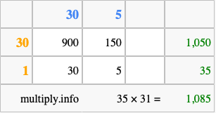 That's all there is to it! As you can see from the box above, the answer to 35 times 31 using the box method is 1,085.