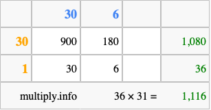 That's all there is to it! As you can see from the box above, the answer to 36 times 31 using the box method is 1,116.