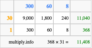 That's all there is to it! As you can see from the box above, the answer to 368 times 31 using the box method is 11,408.
