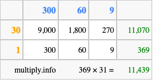 That's all there is to it! As you can see from the box above, the answer to 369 times 31 using the box method is 11,439.