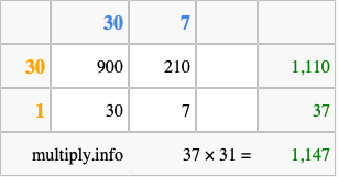 That's all there is to it! As you can see from the box above, the answer to 37 times 31 using the box method is 1,147.