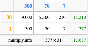 That's all there is to it! As you can see from the box above, the answer to 377 times 31 using the box method is 11,687.