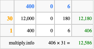 That's all there is to it! As you can see from the box above, the answer to 406 times 31 using the box method is 12,586.