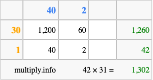That's all there is to it! As you can see from the box above, the answer to 42 times 31 using the box method is 1,302.