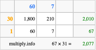 That's all there is to it! As you can see from the box above, the answer to 67 times 31 using the box method is 2,077.
