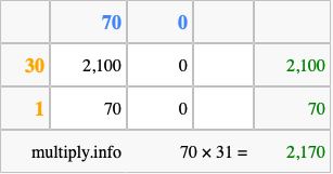 That's all there is to it! As you can see from the box above, the answer to 70 times 31 using the box method is 2,170.