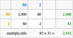 That's all there is to it! As you can see from the box above, the answer to 82 times 31 using the box method is 2,542.