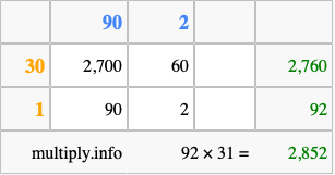 Below is an illustration showing you how to calculate 92 times 31 using the box method, using the instructions above.