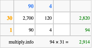 That's all there is to it! As you can see from the box above, the answer to 94 times 31 using the box method is 2,914.