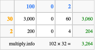 That's all there is to it! As you can see from the box above, the answer to 102 times 32 using the box method is 3,264.