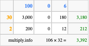 That's all there is to it! As you can see from the box above, the answer to 106 times 32 using the box method is 3,392.