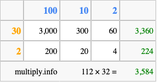 That's all there is to it! As you can see from the box above, the answer to 112 times 32 using the box method is 3,584.