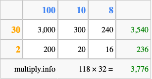 That's all there is to it! As you can see from the box above, the answer to 118 times 32 using the box method is 3,776.