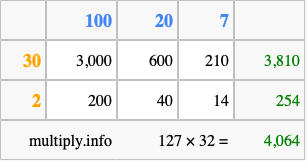 Below is an illustration showing you how to calculate 127 times 32 using the box method, using the instructions above.