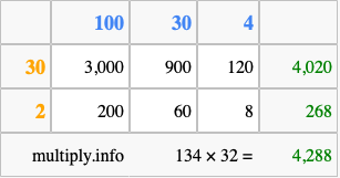 That's all there is to it! As you can see from the box above, the answer to 134 times 32 using the box method is 4,288.
