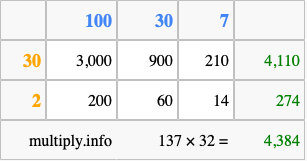 That's all there is to it! As you can see from the box above, the answer to 137 times 32 using the box method is 4,384.