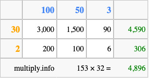 That's all there is to it! As you can see from the box above, the answer to 153 times 32 using the box method is 4,896.