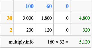 Below is an illustration showing you how to calculate 160 times 32 using the box method, using the instructions above.