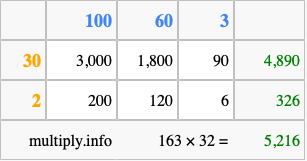 That's all there is to it! As you can see from the box above, the answer to 163 times 32 using the box method is 5,216.