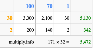 Below is an illustration showing you how to calculate 171 times 32 using the box method, using the instructions above.