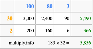 That's all there is to it! As you can see from the box above, the answer to 183 times 32 using the box method is 5,856.