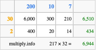 That's all there is to it! As you can see from the box above, the answer to 217 times 32 using the box method is 6,944.