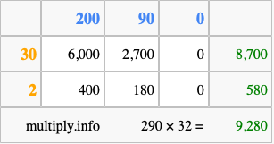 Below is an illustration showing you how to calculate 290 times 32 using the box method, using the instructions above.