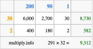 Below is an illustration showing you how to calculate 291 times 32 using the box method, using the instructions above.