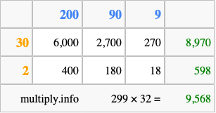 That's all there is to it! As you can see from the box above, the answer to 299 times 32 using the box method is 9,568.