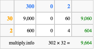 That's all there is to it! As you can see from the box above, the answer to 302 times 32 using the box method is 9,664.