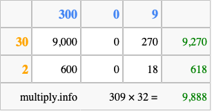 Below is an illustration showing you how to calculate 309 times 32 using the box method, using the instructions above.