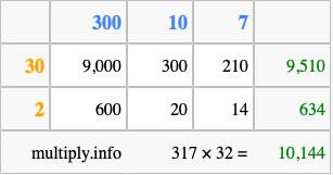 Below is an illustration showing you how to calculate 317 times 32 using the box method, using the instructions above.