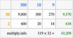 Below is an illustration showing you how to calculate 319 times 32 using the box method, using the instructions above.