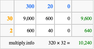 That's all there is to it! As you can see from the box above, the answer to 320 times 32 using the box method is 10,240.